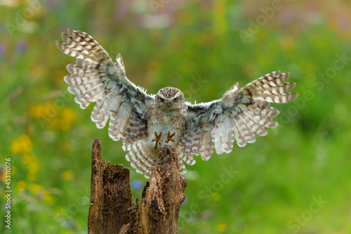 Burrowing Owl (Athene cunicularia) flying in a field with wild flowers in the Netherlands