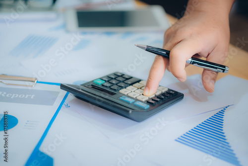 Business analysis - calculator, sheet, graphs (business report) and analyst hand
