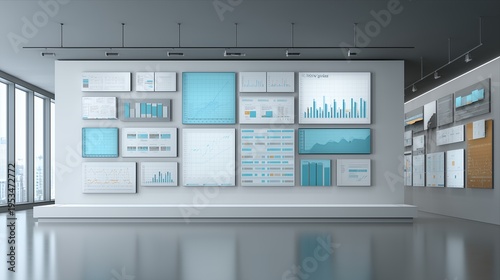 Business Analytics Data Visualization Wall With Multiple Dashboards And Charts In Modern Office, Financial And Market Analysis Screens, KPI Metrics, Corporate Strategy, Business Performance Monitoring