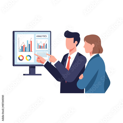 Business analytics presentation: Man points at charts on monitor, woman listens