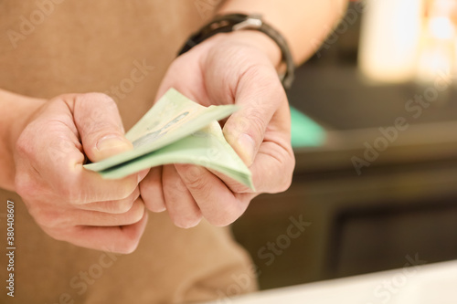 Business and Finance Concept. Closeup of man hand holding and counting money banknote.