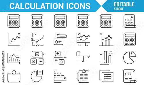 Business and finance-related icons in line art style, featuring calculators, graphs, and charts.