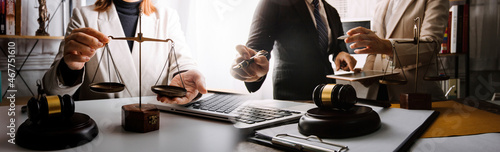 Business and lawyers discussing contract papers with brass scale on desk in office. Law, legal services, advice, justice and law concept picture with film grain effect
