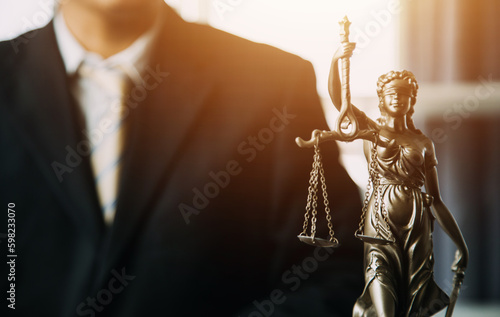Business and lawyers discussing contract papers with brass scale on desk in office. Law, legal services, advice, justice and law concept picture with film grain effect