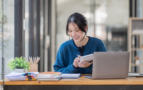 Business Asian woman Using laptop computer and working at office with calculator document on desk, doing planning analyzing the financial report, business plan investment, finance analysis concept.