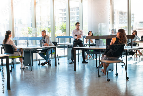 Business colleagues team working behind acrylic glass sneeze by maintaining social distance in modern office