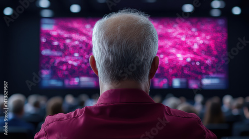 Business conference audience watching vibrant digital presentation on technology