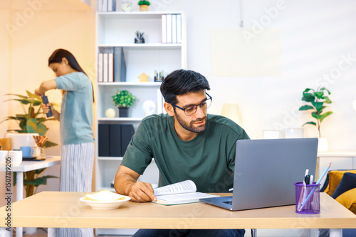 Business couple working, communicating while sitting at the home office desk together. Cheerful couple, calm asian woman and caucasian man working at home with laptop together.