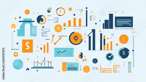 Business data analysis and visualization, graph charts and financial symbols for marketing on a light background
