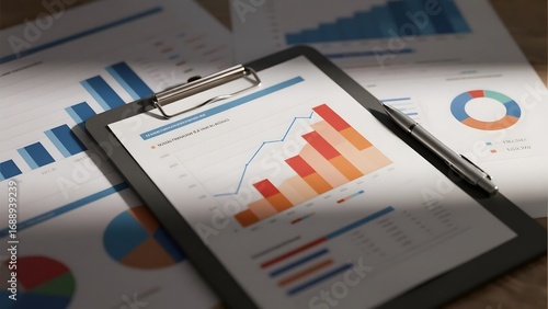 Business data analysis displayed on a tablet with graphs and charts in the background