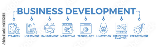 Business development banner web icon with icon of strategy investment management marketing technology innovation competitor analysis improvement