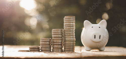 business finance and saving money investment , Money coin stack growing graph with piggy bank saving concept. Balance savings and investment.