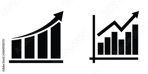 Business graph with arrow icon, Growing graph icon isolated. Increasing bar graph with upward trending arrow. Analytics related vector glyph icon. Isolated on white background. Vector illustration.