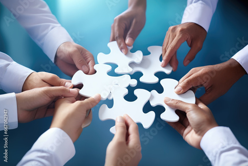 Business hands, puzzle and group of people for solution, teamwork and goals, integration and success. Team building, synergy and collaboration