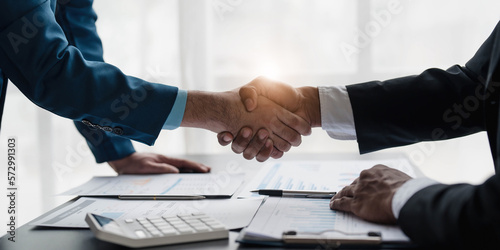 Business handshake for teamwork of business merger and acquisition,successful negotiate,hand shake,two businessman shake hand with partner to celebration partnership and business deal concept.