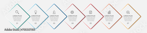 business infographic design 7 parts or steps, there are icons, text and numbers, square design with thin colored lines that are connected to each other for workflow diagrams, banners and your business