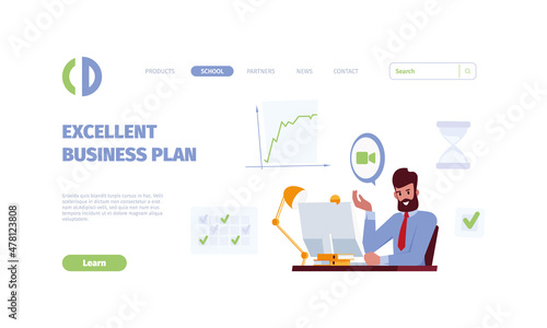 Business landing. Busy character sitting at workplace with laptop or pc monitor on table garish vector web page template