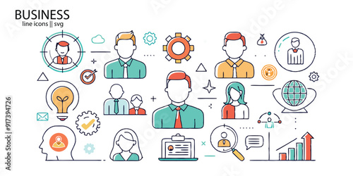 Business line icons. Team, business people, human resources, collaboration, research, meeting, partnership, support, businessman. Editable stroke. Vector illustration