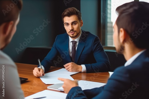 Business man explaining terms of contract to his clients. Closeup of business meeting with professionals. Generative AI.