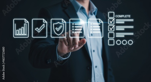 Business Man Interacting with Digital Compliance Checklist Interface, Data Protection and Regulations