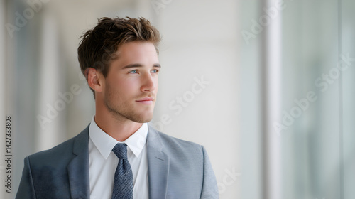 Business Man Medium Single Shot Front Side Young White American Male Suit Tie Walking Hallway Modern Office