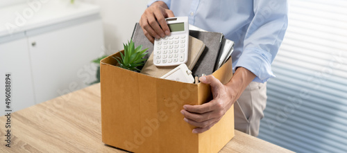 Business man sending resignation letter and packing Stuff Resign Depress or carrying business cardboard box by desk in office. Change of job or fired from company.