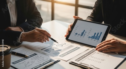 Business meeting analyzing data and strategy documents