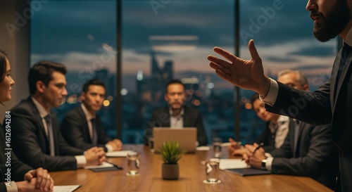Business Meeting at Night with Cityscape View and Leader Gesturing