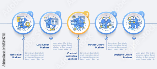 Business model approach blue vector infographic template. Enterprise presentation outline design elements. Data visualization with 5 steps. Process timeline info chart. Workflow layout with line icons
