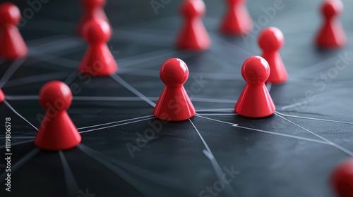 Business networking concept with red game tokens connecting in a digital landscape representing collaboration and internet technology innovation