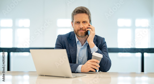 Business office interior. Businessman chatting phone online in office. Business man in suit using phone. Office worker solves cases on phone. Office manager talk phone. Ceo manager using smartphone.