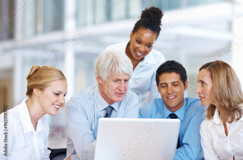 Business people, laptop and accounting report in office, budget planning and team for collaboration. Staff, online and stock market website for exchange revenue, reading update and ideas for growth