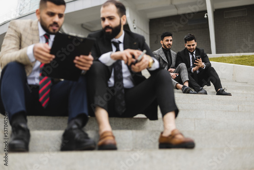 Business people outdoor meeting. Several men in suits sit on the steps of a street staircase during a work break. Successful promotion and recognition in the team of employees.