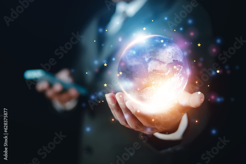 Business people point to the virtual hologram in the internet cyberspace, online business and graph the rising trend of finance, future life. Image from space furnished by NASA