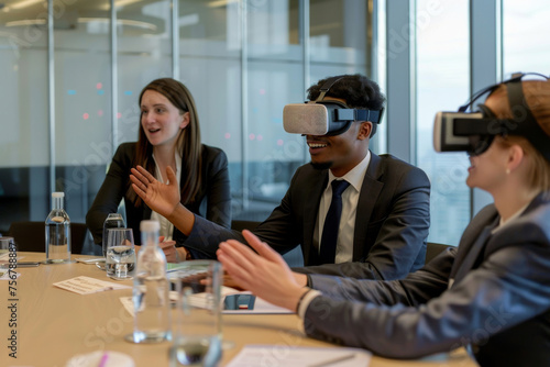 Business people using VR headsets during a collaborative meeting in a modern office space