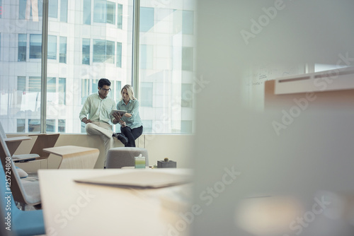 Business people with digital tablet sitting on window sill, discussing