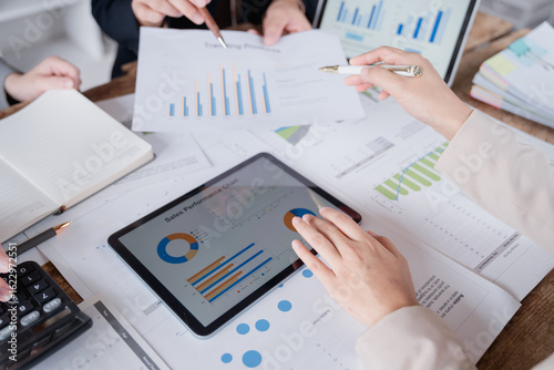 Business people working together and analyzing financial data on digital tablet and paper charts, using calculator and pointing at charts during a corporate meeting