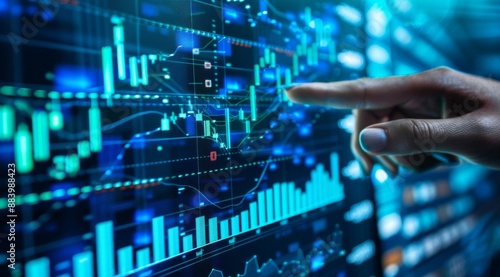 business person is pointing at stock market graphs on an interactive screen, with blue and green color tones used for financial data visualization