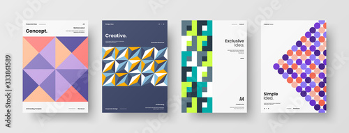 Business presentation vector A4 vertical orientation front page mock up set. Corporate report cover abstract geometric illustration design layout bundle. Company identity brochure template collection.