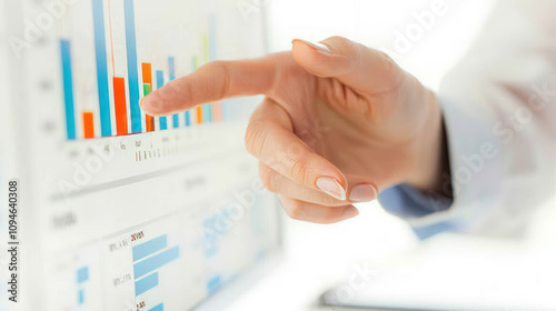 Business Professional Analyzing Data Trends on a Digital Graph with Colorful Bar Charts in a Bright Office Environment