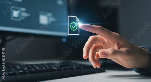 Business Professional Digitally Approving Document With Glowing Checkmark On Modern Computer Screen, Signifying Successful Task Completion.