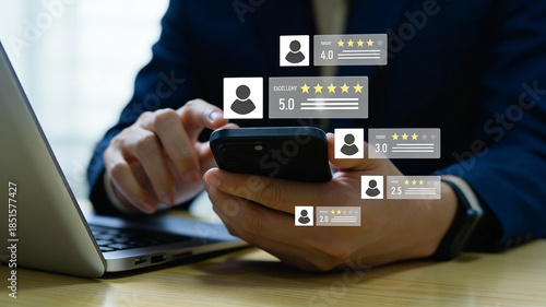 Business professional in dark suit using smartphone with user rating UI overlay (stars, profiles), bright modern office, data-driven feedback style.