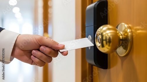 Business professional inserting keycard into hotel door lock for secure access in luxury accommodation
