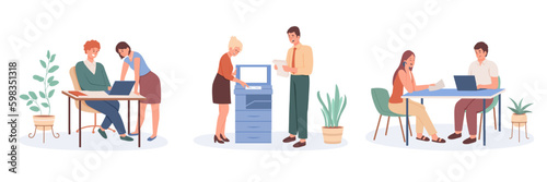 Business set of colleagues talking, working in different offices in company