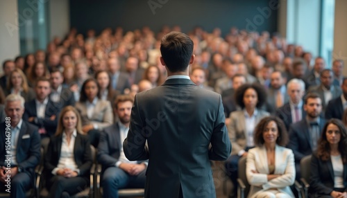 Business speaker gives presentation conference hall. Back view businessman in suit. Audience diverse group of attendees. Public speaking, communication, business meeting, teamwork, education.