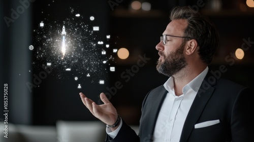 Business Start-Up Concept - Rocket Launching from Desk with Floating Business Icons in 3D Illustration