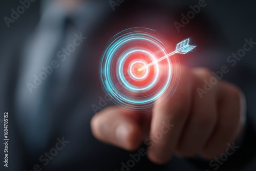 Business strategist thinking with glowing holographic target icon, symbolizing goals and achievement.