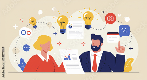 Business Team Brainstorming with Lightbulb Ideas and Data Analysis Illustration.