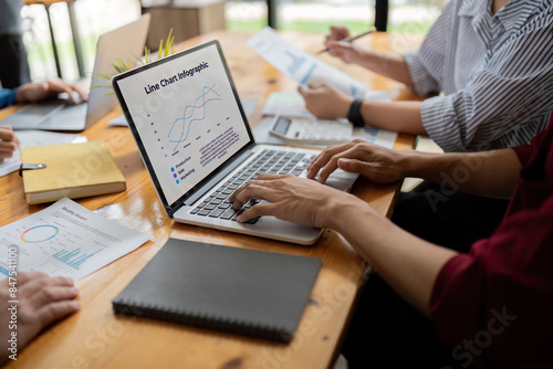 Business Team Discuss Data Analysis with Line Charts Infographic on Laptop in Modern Office Setting