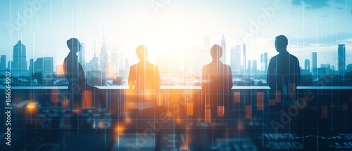 Business team discussing market insights, copy space, bright tones, double exposure silhouette with charts